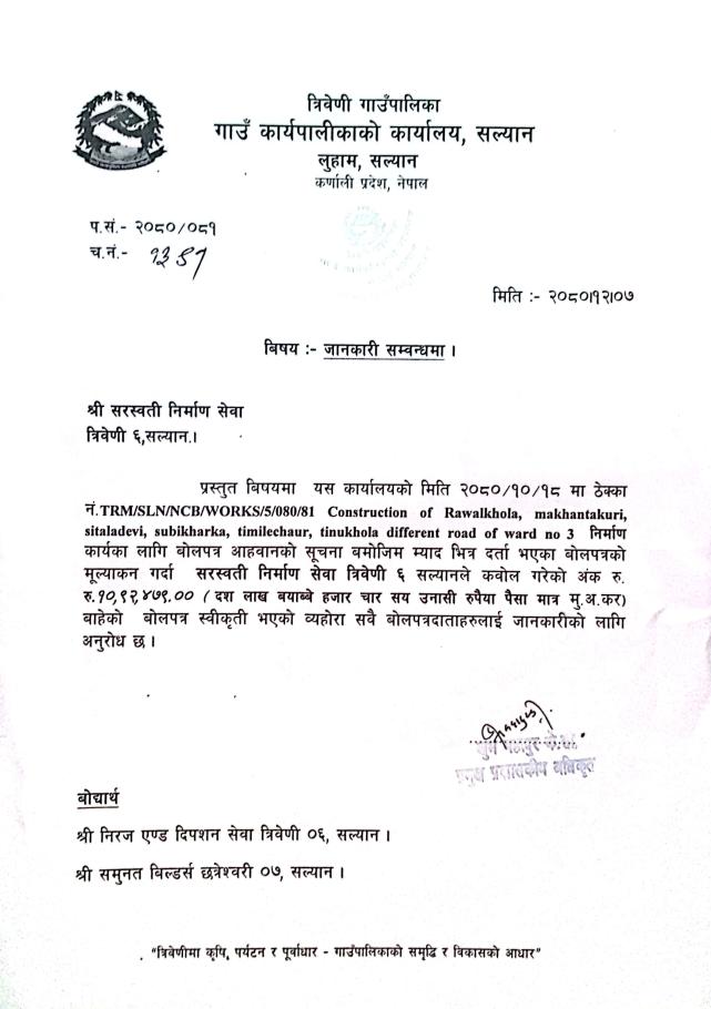 बाेलपत्र स्वीकृत गर्ने अासयकाे सूचना