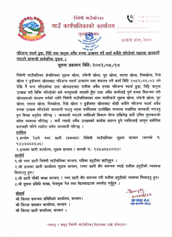 नदीजन्य पदार्थ ढुङ्गा, गिट्टी तथा बालुवा अवैध रूपमा उत्खनन गर्ने कार्य कसैले गरिरहेको पाइएमा जानकारी गराउने सम्बन्धी सार्वजनिक सूचना ।