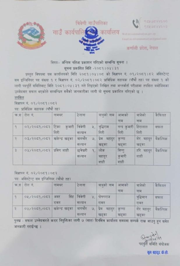 प्राविधिक सहायक (पाँचौं तह) र असिस्टेन्ट सव इन्जिनियर चौथो तहको अन्तिम नतिजा प्रकाशन गरिएको सम्बन्धी सूचना।