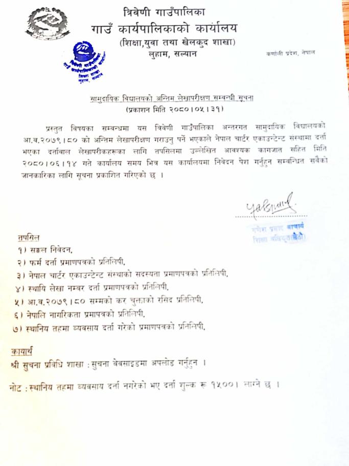 » सामुदायिक विद्यालयको अन्तिम लेखा परीक्षण सम्बन्धी सूचना ।