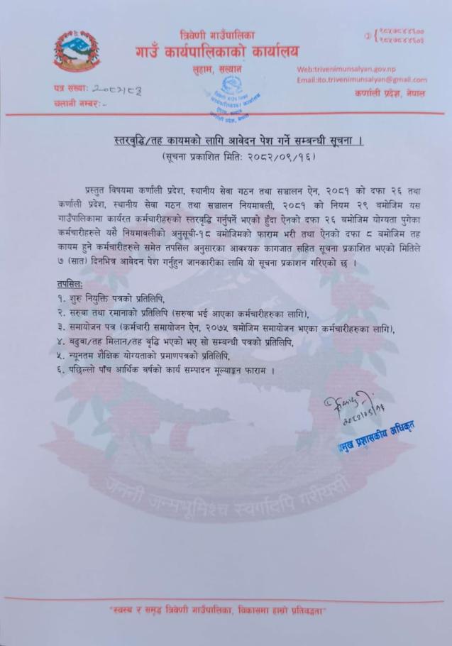 स्तरवृद्धि/तह कायमकाे लागि आवेदन पेश गर्ने सम्बन्धी सूचना ।